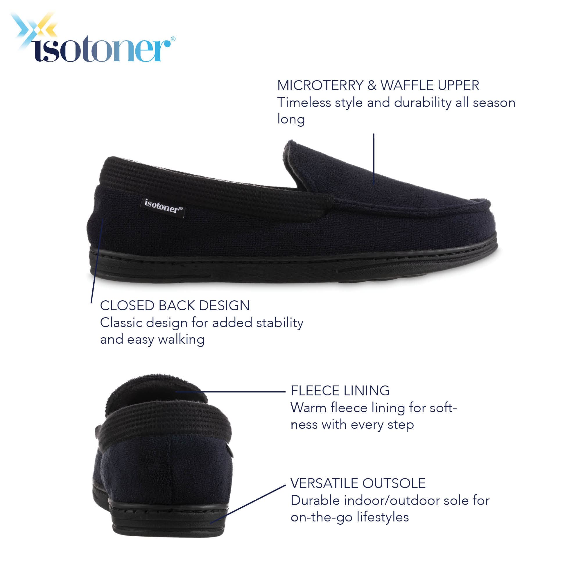 isotoner Men's Microterry and Waffle Travis Moccasin Slippers With Memory Foam Insole and Durable Rubber Outsole